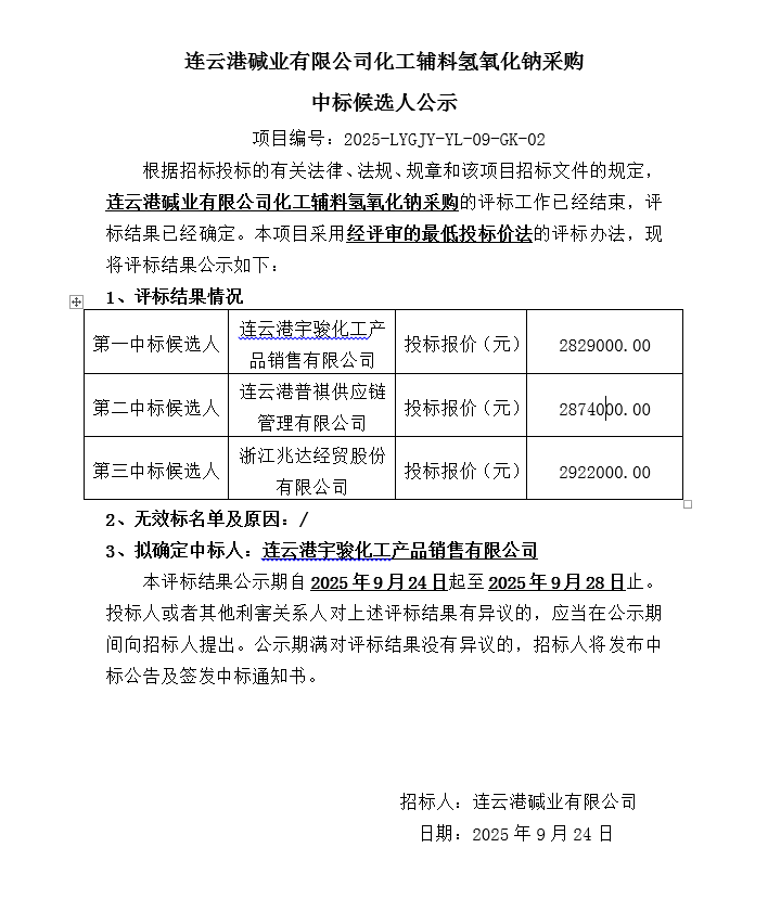 連云港堿業(yè)有限公司化工輔料氫氧化鈉采購中標(biāo)候選人公示