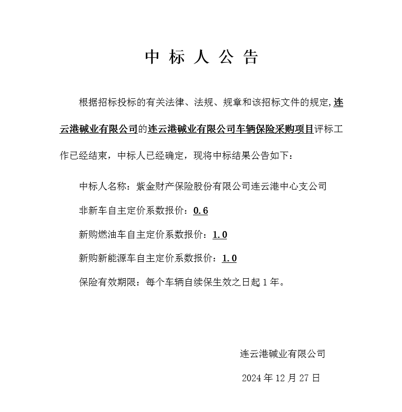 連云港堿業(yè)有限公司車輛保險采購項目中標(biāo)人公告
